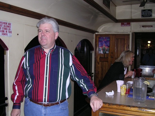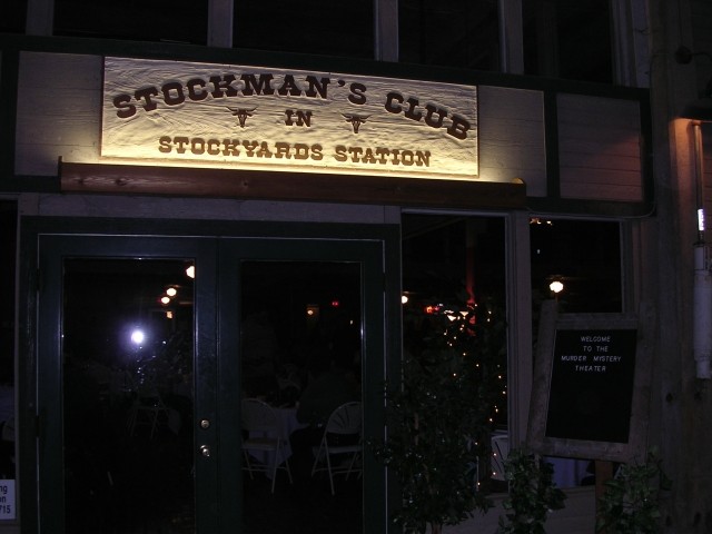 We boarded the train at the Grapevine Depot for the Stockyards and met some of the possible candidates for the murder. We left at 6:00 that evening for an hour and a half train ride to Cowtown. Once there we were escorted to the Stockman's Club for a buffet dinner. We then had to help Marshall Courtright try and figure out just who the perpetrator of the dastardly deed was. Once the villain was caught we boarded the train again for the return trip which ended shortly after midnight.