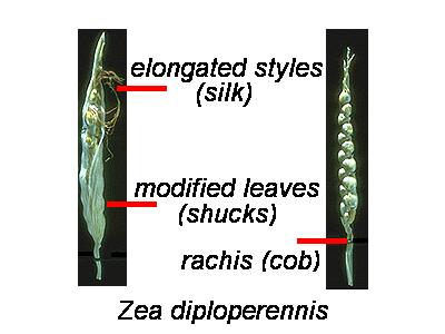 Flowers: Pistillate spikelets borne in several rows on a much-thickened cylindrical rachis (cob), the whole inflorescence covered with usually modified leaves (shucks) and the entire "ear" marked at the end by the termini of elongated styles (silk); Staminate spikelets borne in pairs on the spike-like racemes at the top of the plant